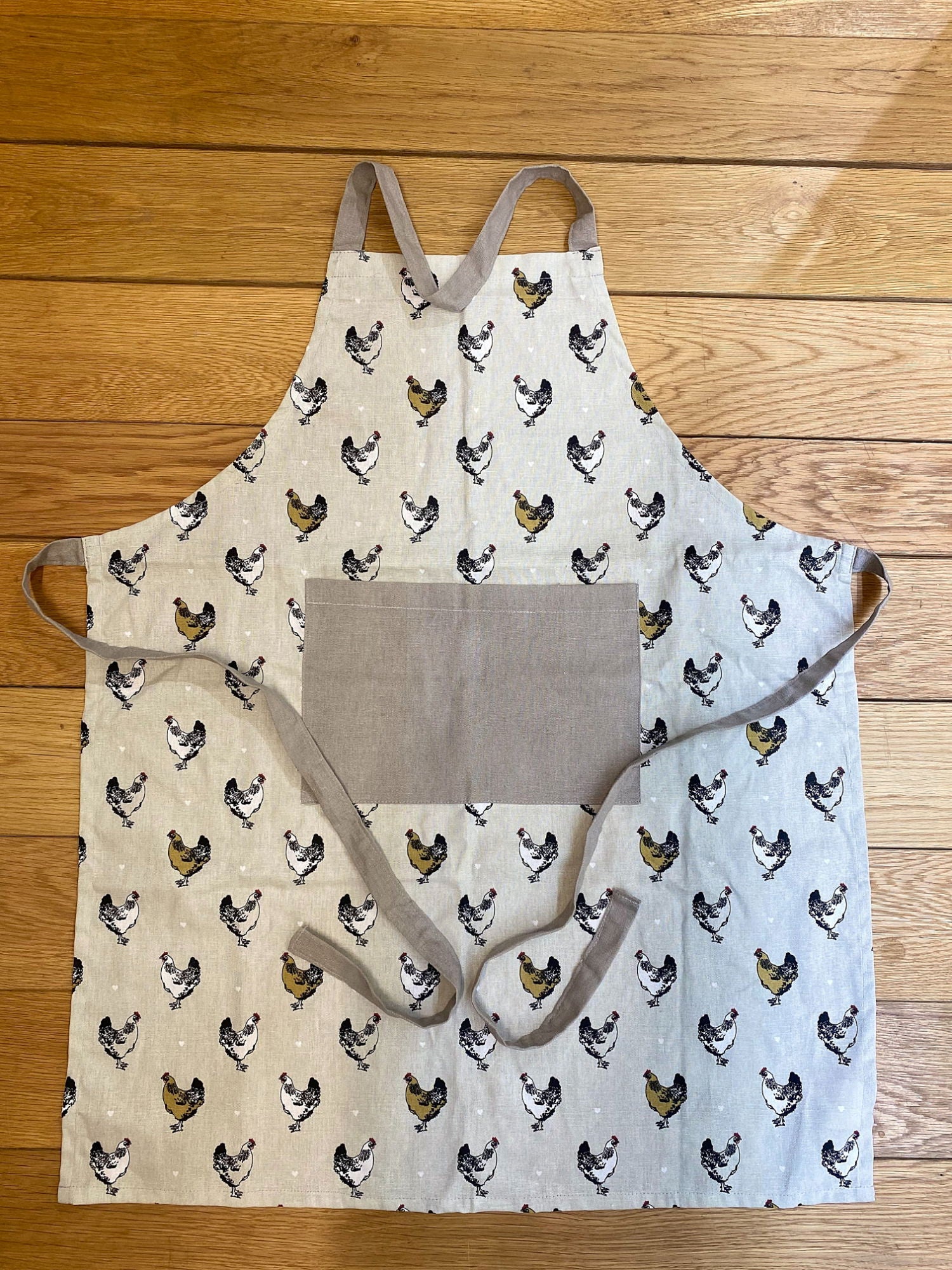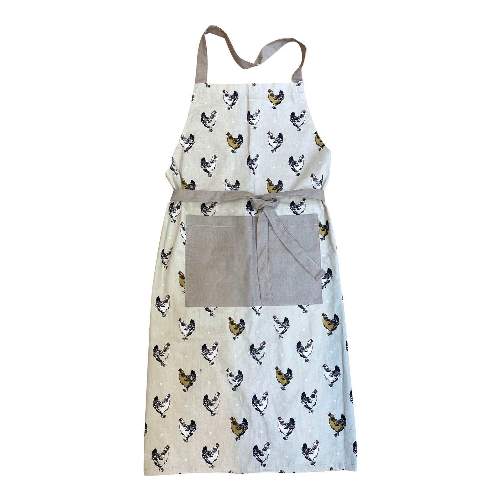 A cotton pinafore style apron embellished with chickens images in white and gold. They are printed on a neutral calico with a contrasting front pocket, neck loop and waist ties. This beautiful simple design is part of the country kitchen collection. Apron measurement: H85 x W69cm. Neck to front 23cm. Waist ties: 82cm. Front pocket: W30.5 x H20cm. SKU: KG1078