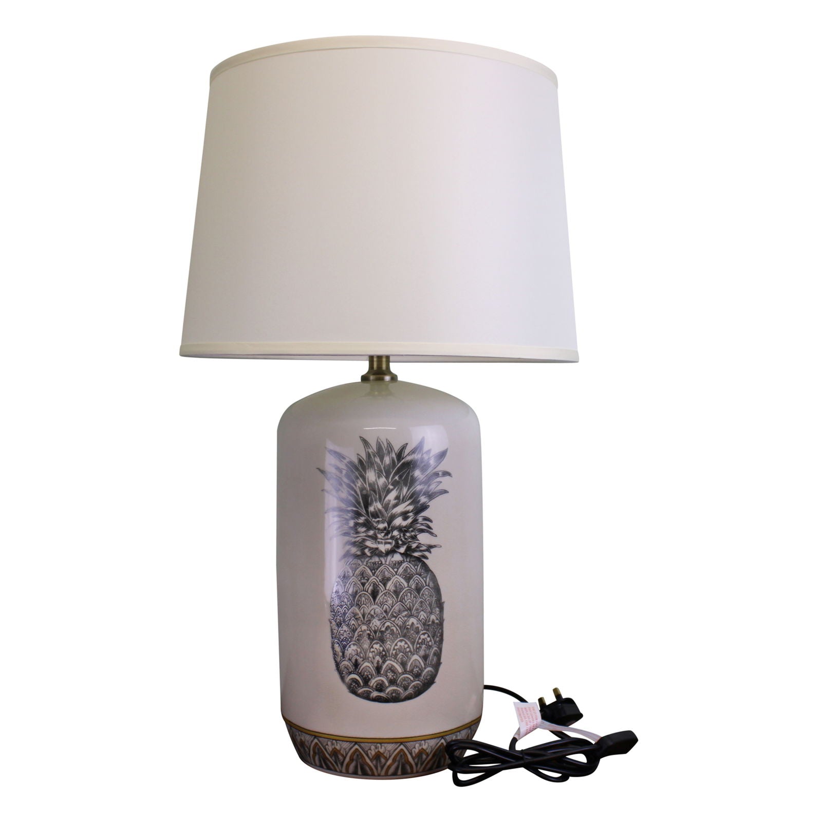A glazed ceramic lamp with a black and white pineapple design with a felt base, with an off white shade. A great looking table lamp for adding light to a hallway or dark corner, and perfect as a bedside table lamp with a soft underside to protect your furnishings. The classic design and shape ensures it will suit many decorating styles. Create mood lighting with a stylish home accessory. Takes a single 60w e14 bayonet cap bulb (not included). Takes a single 60w e14 bayonet cap bulb (not included). Length of cable 1.9m. Fitted with UK Plug Only. Length to switch from base 36cm, Shade size, bottom diameter 40cm, top diameter 36cm, height 29cm. Measurements: 40 x 69 x 40cm