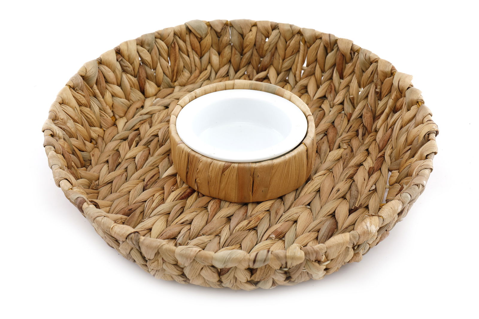 A round raffia basket tray perfect for serving crisps and dips. It has a 35cm diameter with an inner circle holding a white ceramic dipping bowl. The bowl measures 11cm in diameter with a lip edge of 1cm depth of 3.5cm. Measurements: D8 x H35 x W32cm SKU: NI0958