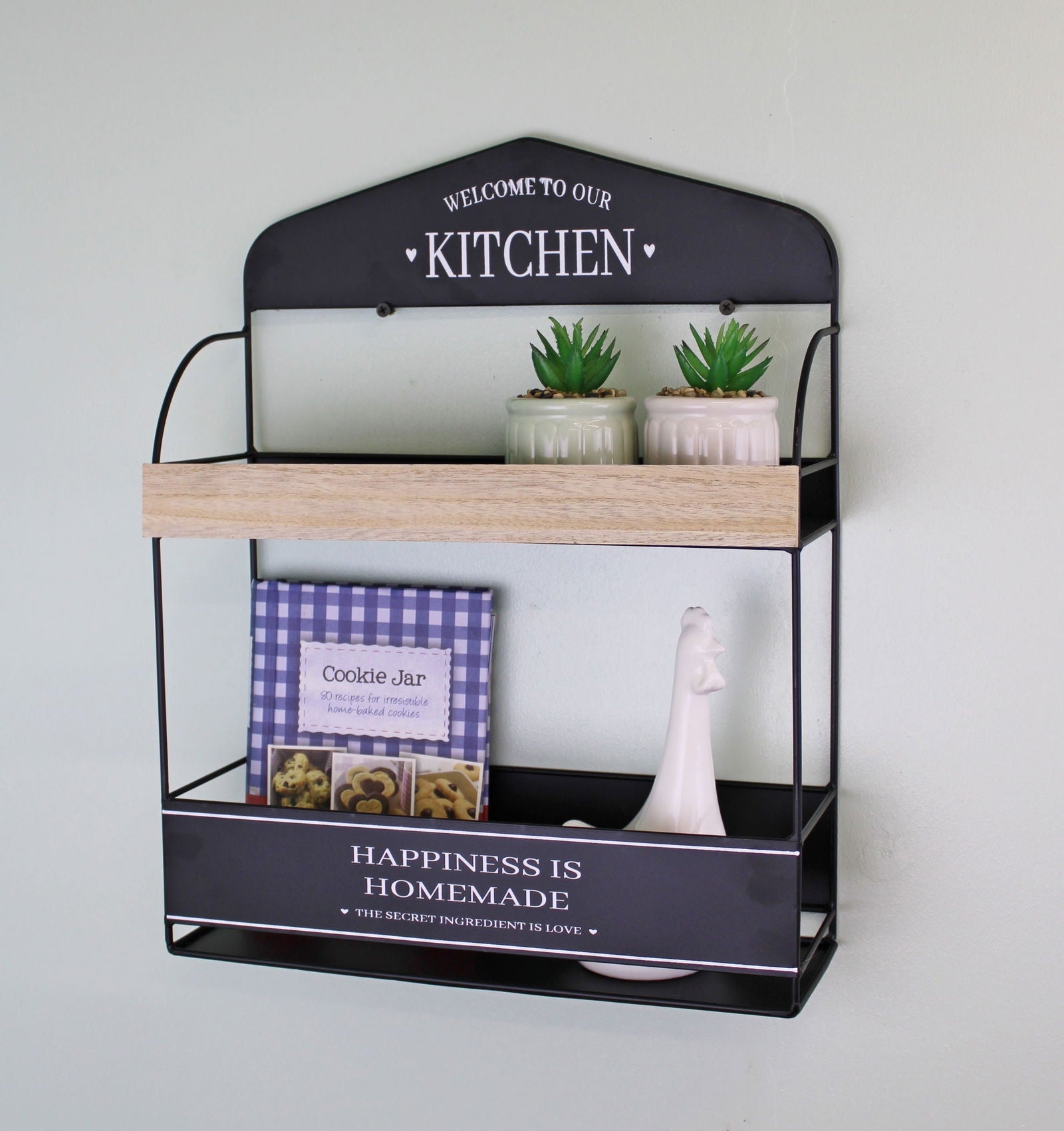 A great place to store your kitchen accessories, this stylish unit hangs easily on your wall and can be used to store your kitchen bits & bobs. Featuring the wording 'Welcome to our kitchen' and 'happiness is homemade, the secret ingredient is love'. Made of iron and MDF, this item is made to last. Top shelf W34.5 D11 H12cm. Bottom shelf W34.5 D11 H23cm Measurements: 12.5 x 44.2 x 35cm SKU: KG0737