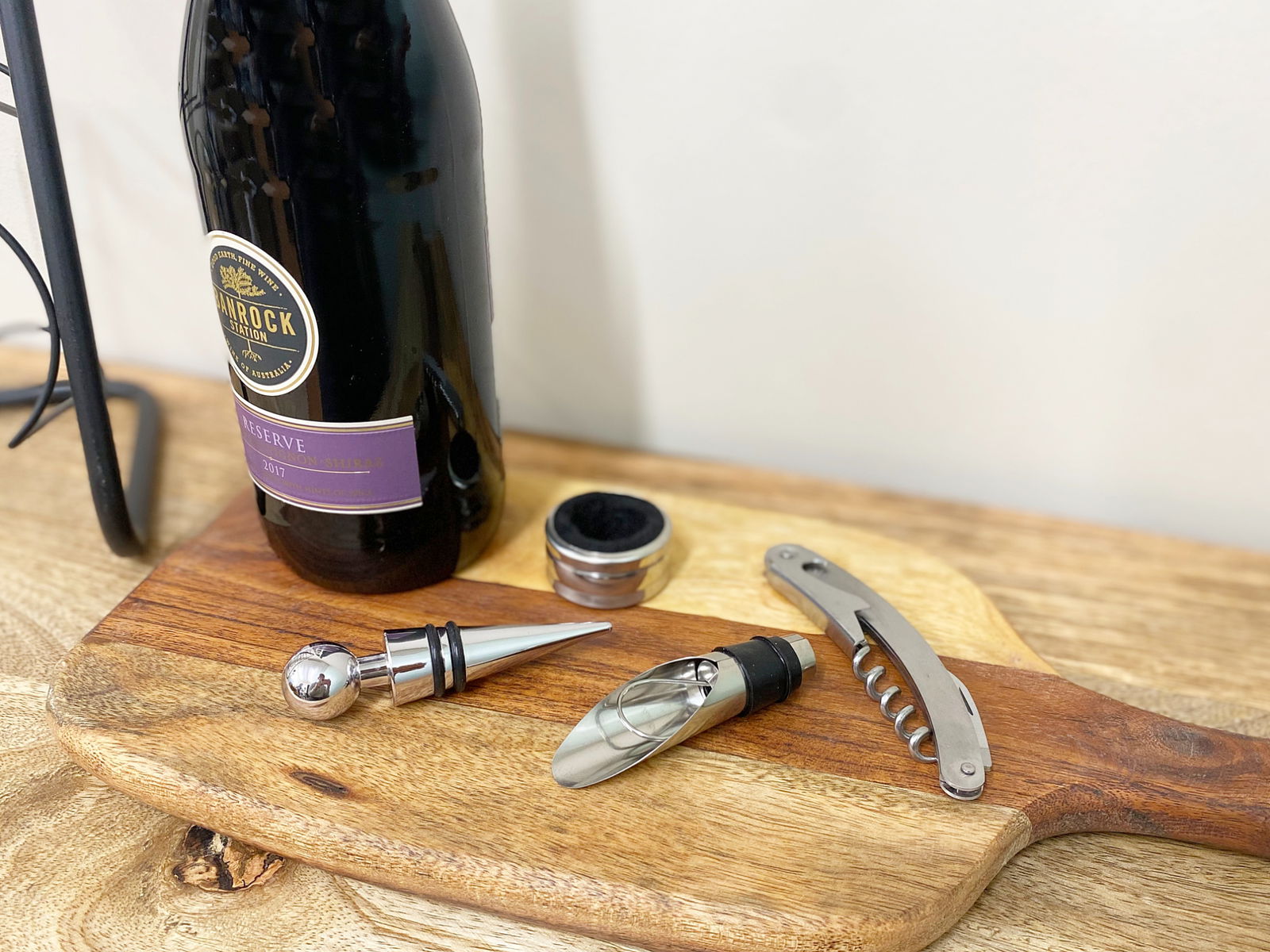 A four piece wine tool kit in silver includes a corkscrew, bottle stop, aerating wine pourer and wine drip collar ring. This gift is presented within a box and is part of the gentleman's essentials range. Boxed measurements: D3 x H22 x W8cm SKU: GR0004