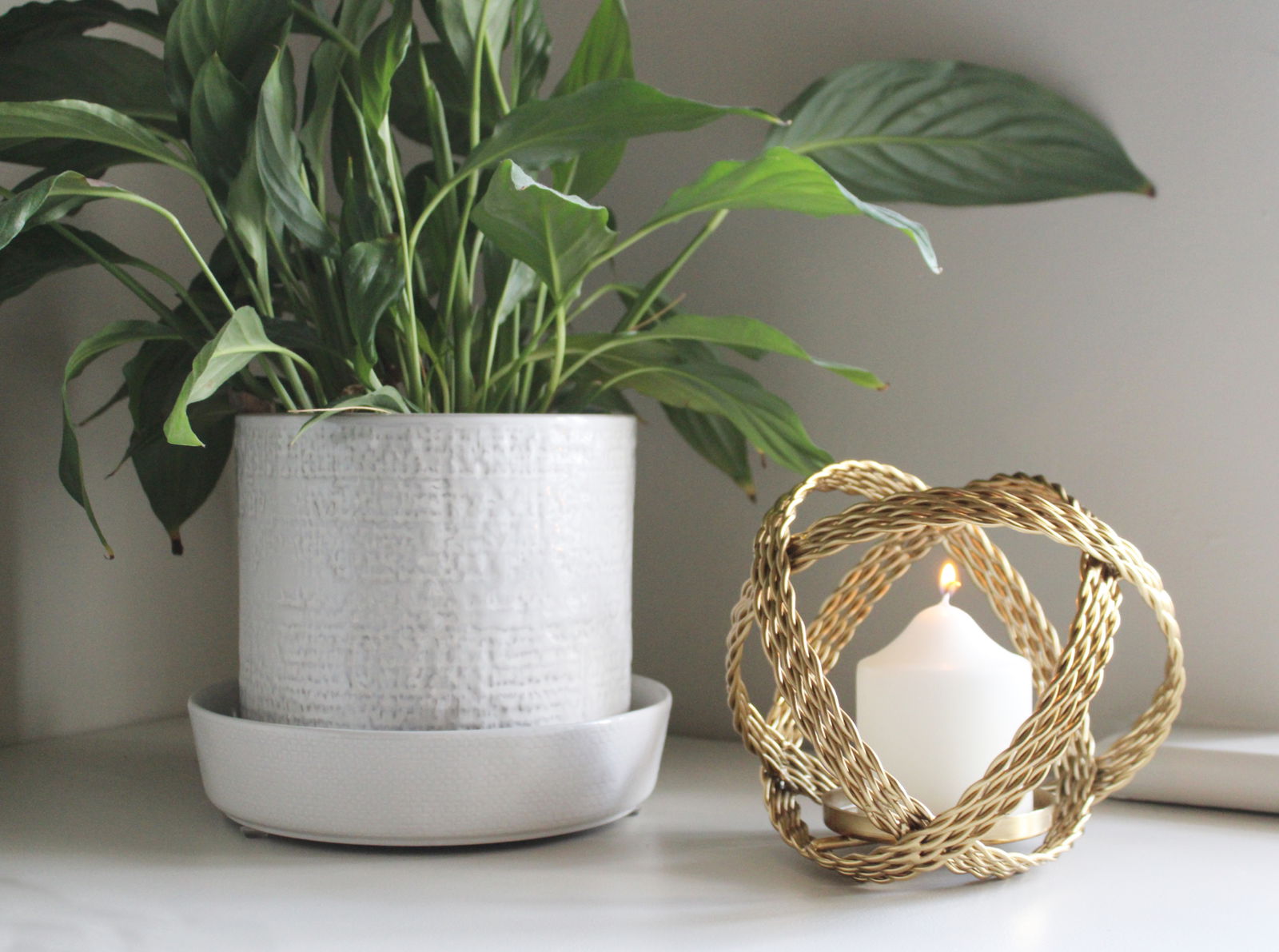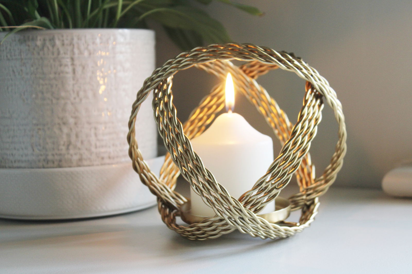 Gold coloured candle holder, with large central candle plate. Featuring intricate twisted metal detailing forming a ball shaped design. Holds one pillar candle with a width of up to 9 cm in diameter. Measurements: D18 x H16 x W18cm