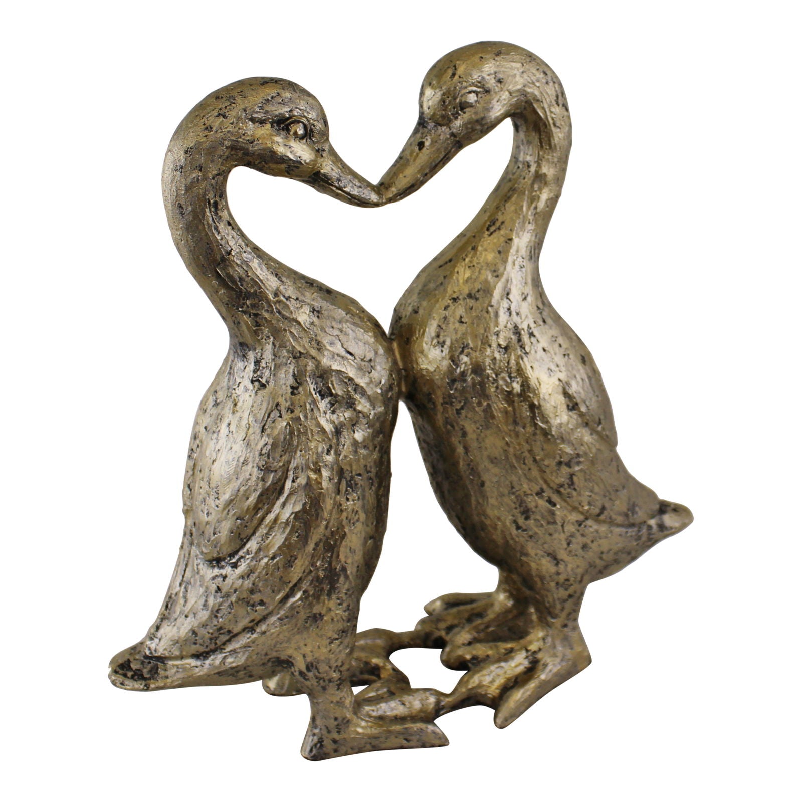 A pair of golden ducks facing each other to make a heart shape, a beautiful ornament for your home or would make a lovely gift. Made of 100% polyresin with a distressed gold finish. Measurements: 7 x 25 x 22cm SKU: OR1476