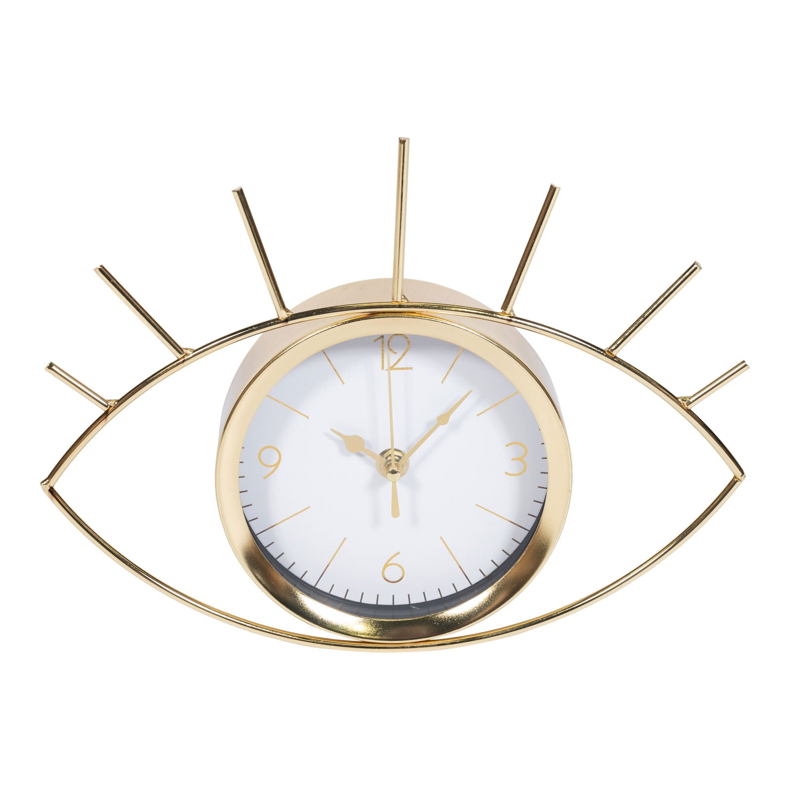 This gold effect eye clock is an interesting piece of unusual design. The clock face is situated in an eye shape with eyelash. A gold effect eye clock with the clock face measuring 12.5cm. 1 x AA battery is required. The overall measurements are: D4.5 x H30 x W24cm SKU: TJN0395