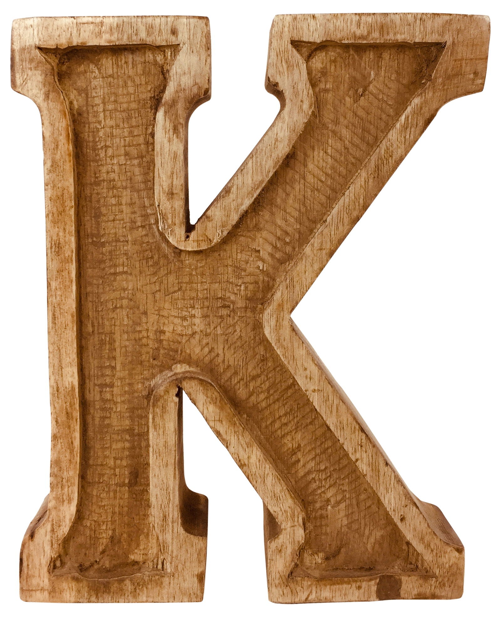 A solid hand carved mango wood letter K. The letter features a rustic embossed design which is hand carved into the letter. The letter has an intricate line detail on the front and can be used to create a variety of words to fit in any scenery. The letter is free standing or can be wall mounted via the hanging bracket on the back. Perfect for new baby's, kid's bedrooms, christening, engagement presents, wedding's, birthday's, and bars or cafes. Measurements: W15.5cm X D4.5cm XH20.5cm. Weight: 0.66kg.