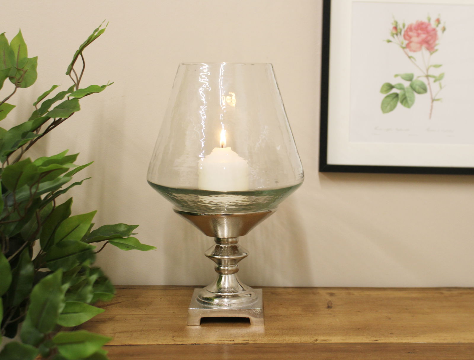 This glass candle stand has been created using a combination of classic and contemporary designs, featuring a timeless and elegant shape in a clear coloured glass. With a polished silver base, this candle stand can hold one pillar candle with a width of up to 8 cm in diameter. Add your favourite scented candle, to instantly transform your space with this elegant glass hurricane candle stand. Measurements: D22 x H38 x W22cm