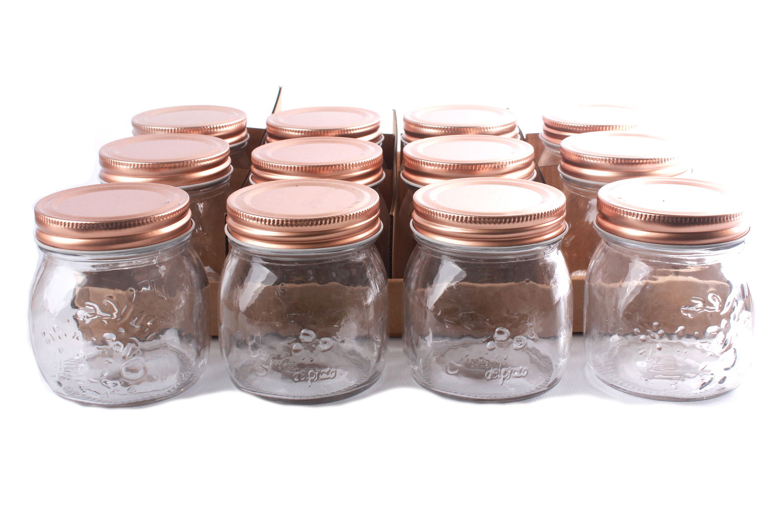 This glass embossed storage jar with a copper screw lid would be great for storage within the kitchen. The dimensions of the jar are 9x9x1cm, with a volume of approx 300ml. The copper lid is a screw top and is 1cm deep. Overall measurements are: D8 x H9 x W8cm SKU: KG0077