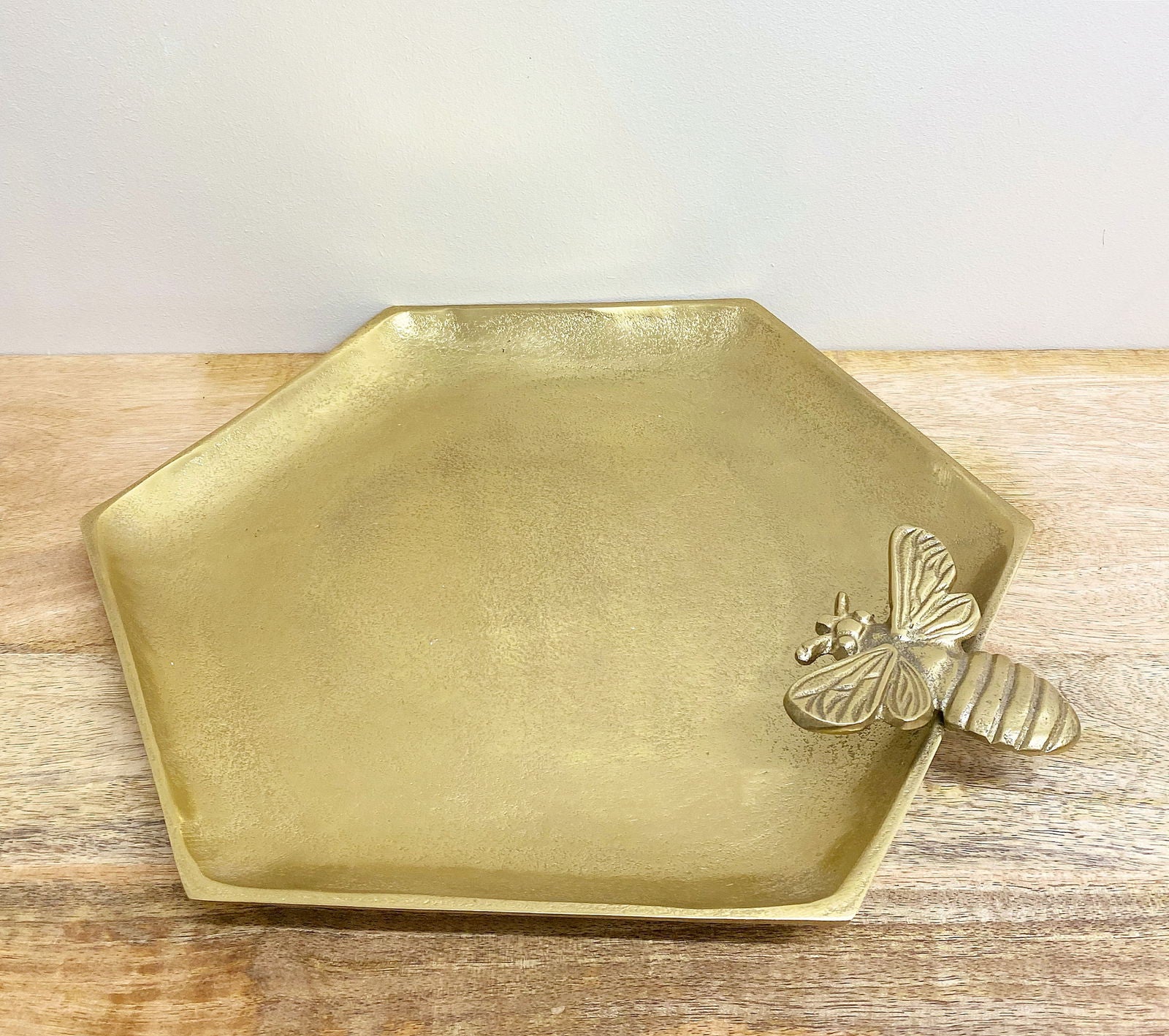 A hammered effect gold metal tray in the shape of a honeycomb with a large bee in gold metal on one side. An unusual and attractive piece useful as a decoration or serving platter. The tray has a 33cm diameter, The bee is W11cm x D9cm x H0.4cm. Measurements: D37 x H4 x W36.5cm