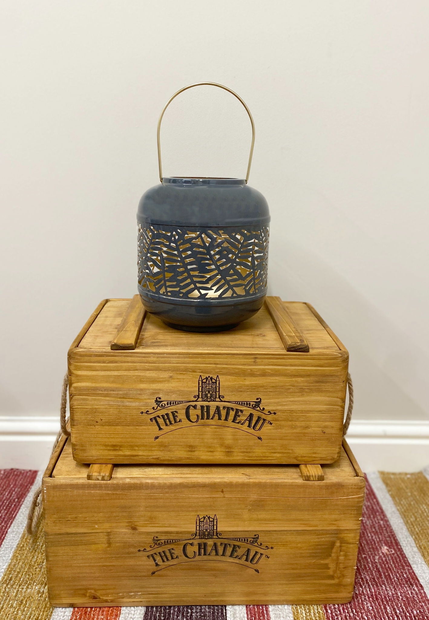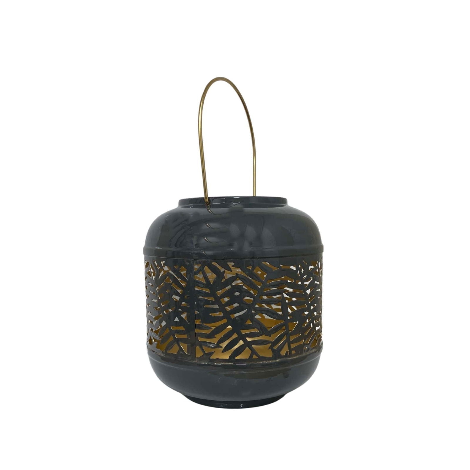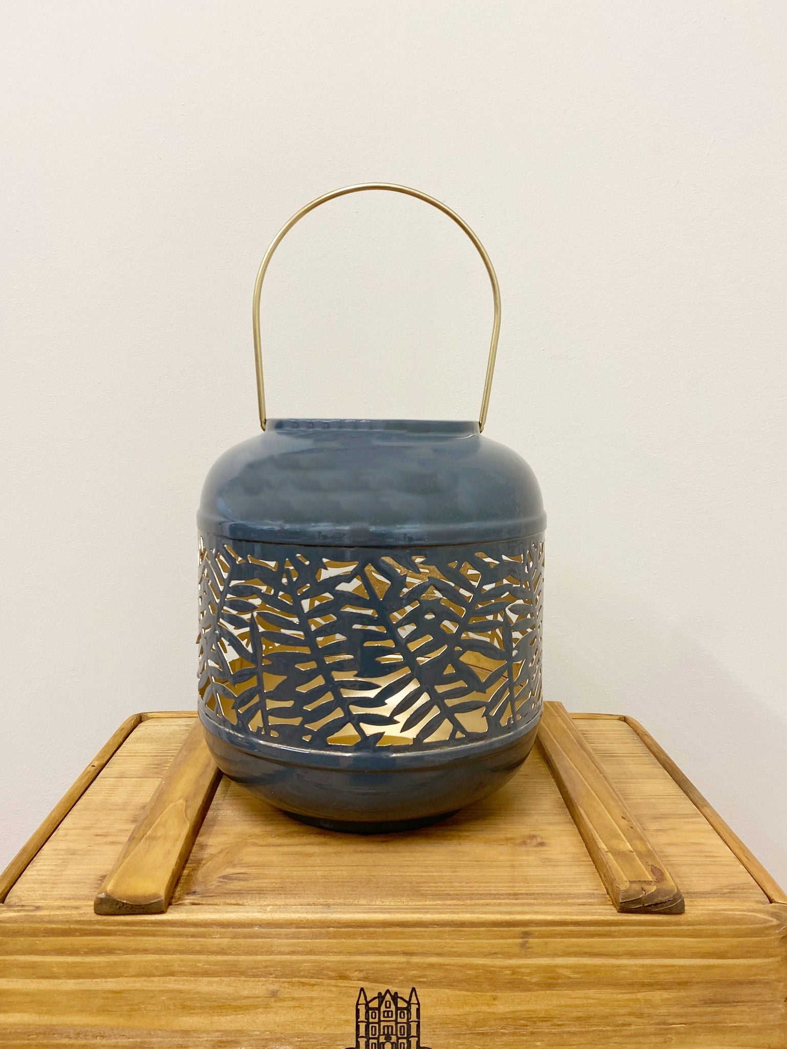 A very attractive metal lantern with carved out leaf pattern around the middle to create beautiful dancing shadows from the inner glow of a pillar candle, which is not included. The finish is a highly polished smokey grey finish on the outside with a gold inner and folding handle. The lanterns base diameter is 12cm with a height of 27cm. The handle is 13.5cm deep. Measurements: D23 x H40 x W23cm