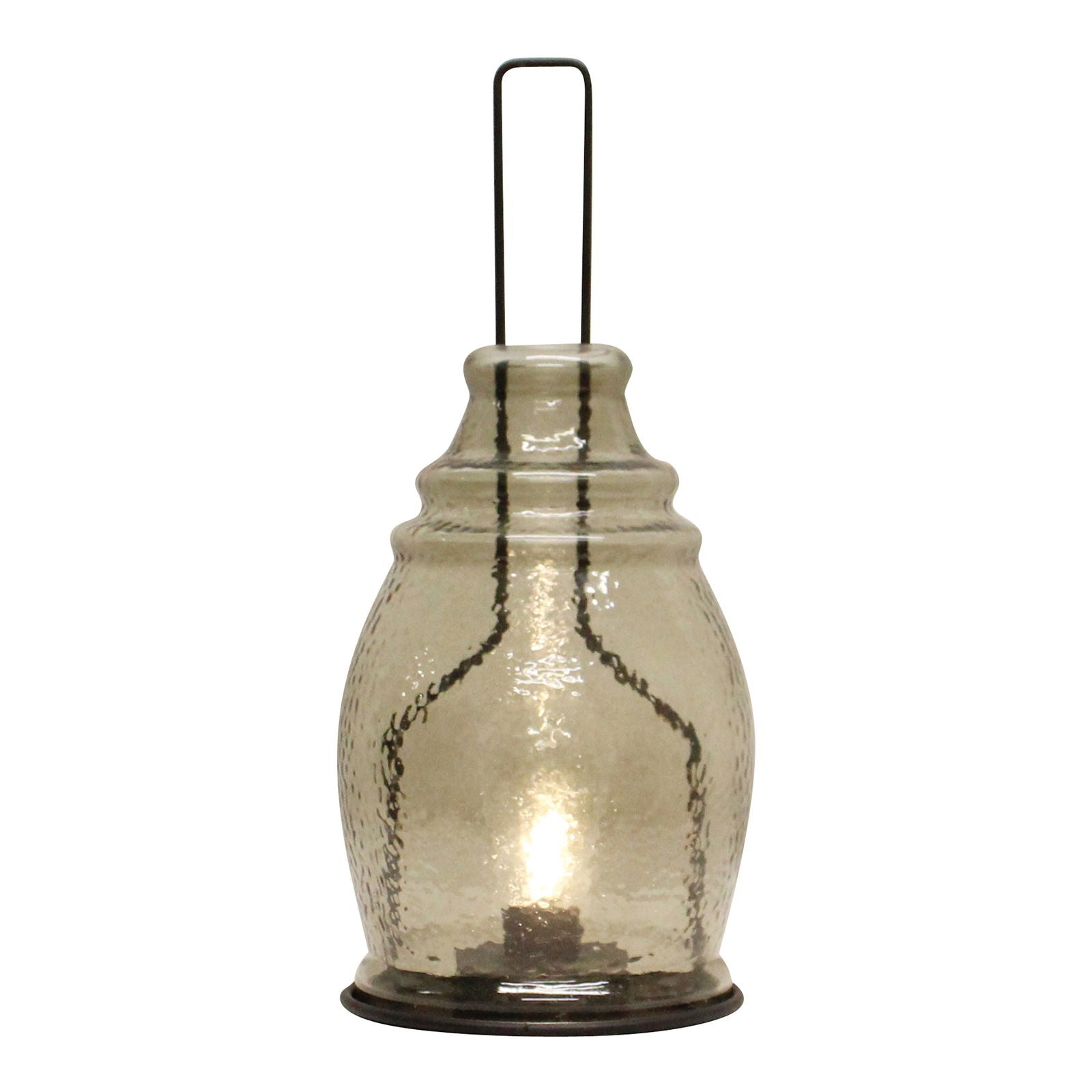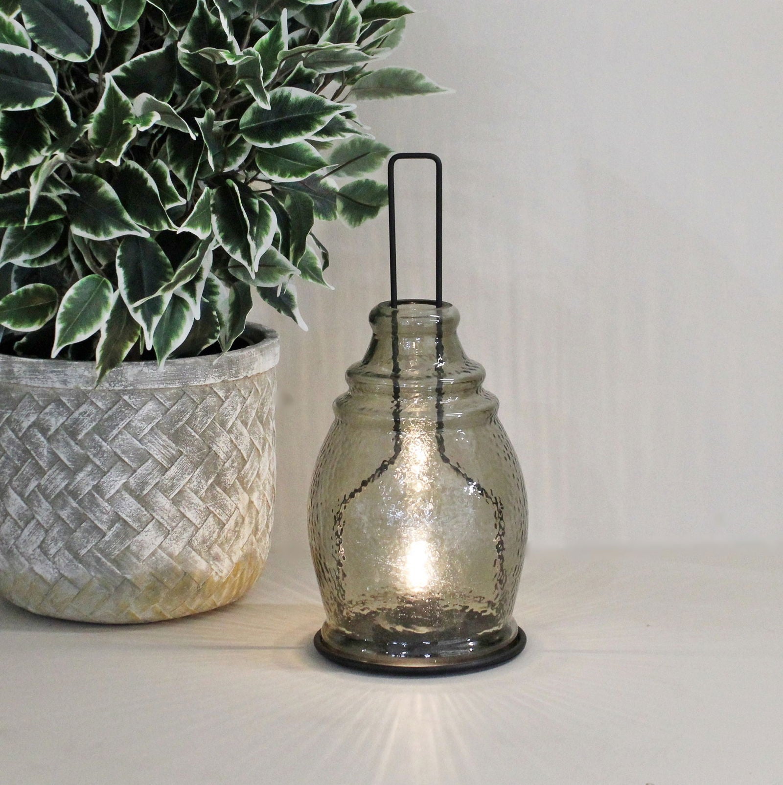 This LED lantern stands 35 cm high and can be used standing on a table or hanging as required. It has a classic shaped, grey glass surround that contains a non replaceable LED bulb. Suitable for use indoors and outdoor covered areas such as gazebos. Made of glass and iron. The lamp requires 3 x AAA batteries (not included). Measurements: D14.5 x H35 x W14.5cm