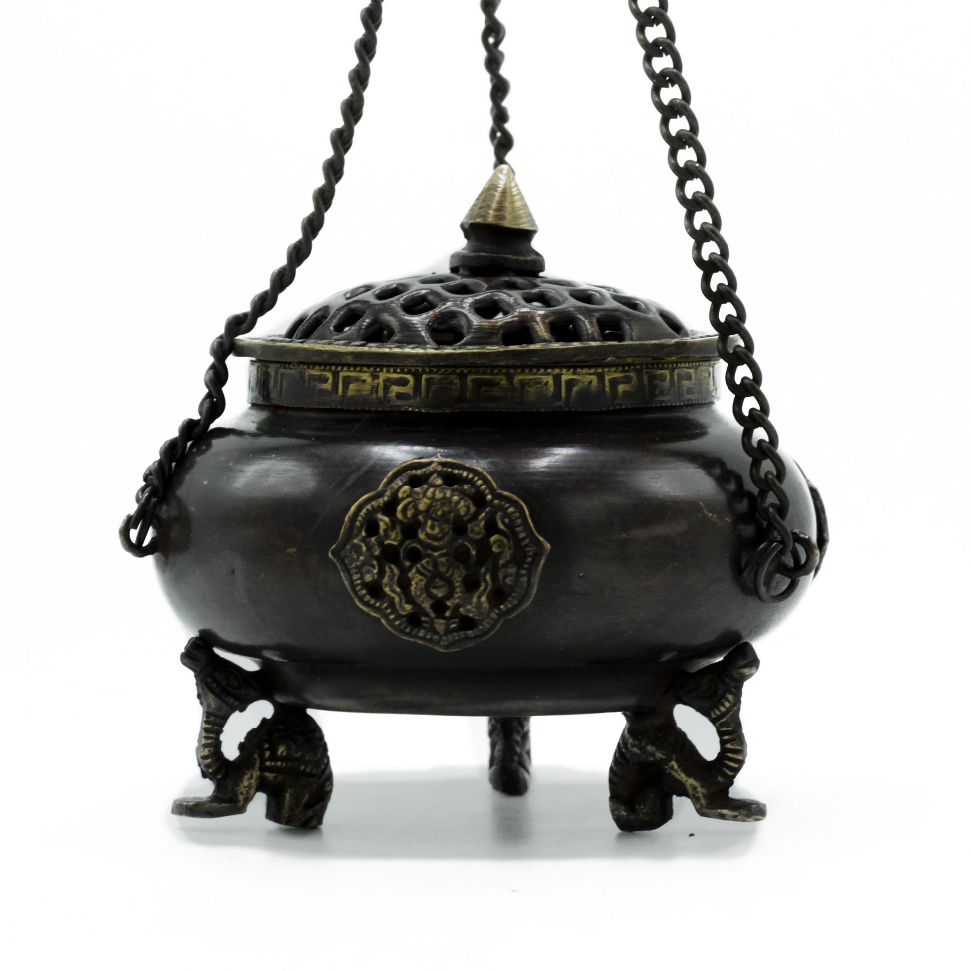 Lrg Brass Tibetan Burner - Four Symbol Hanging Pot