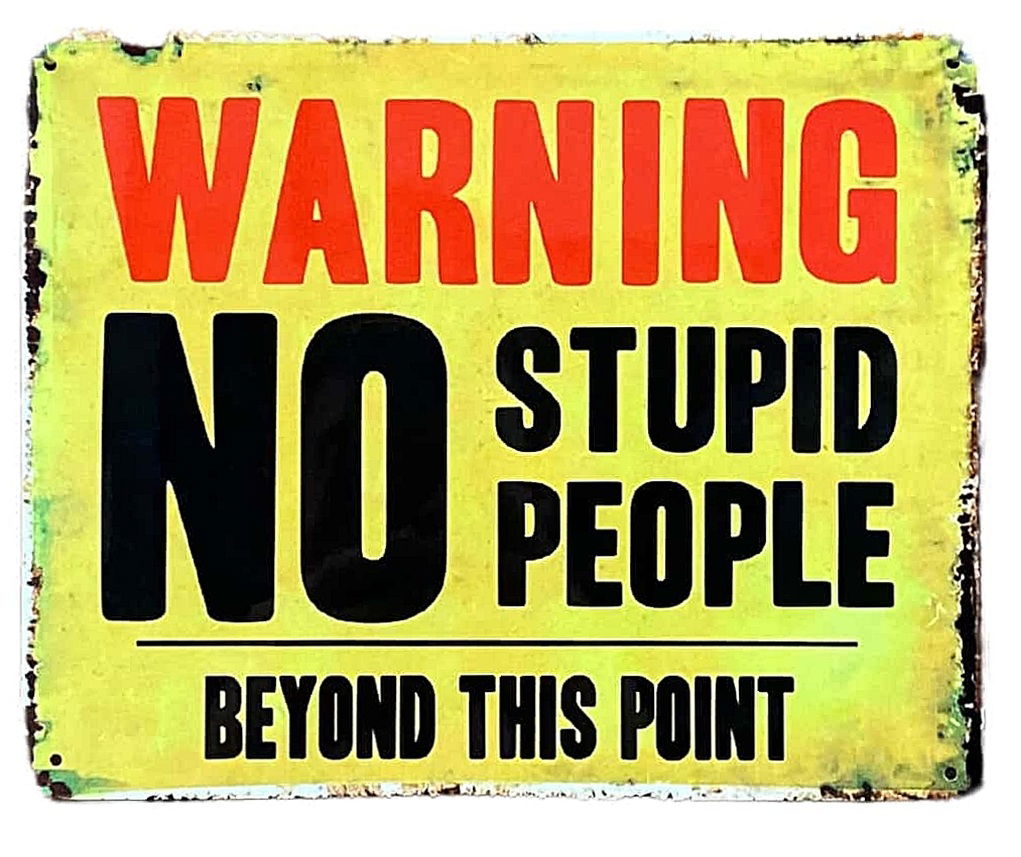 Metal Advertising Wall Sign - Warning No Stupid People Beyond This Point