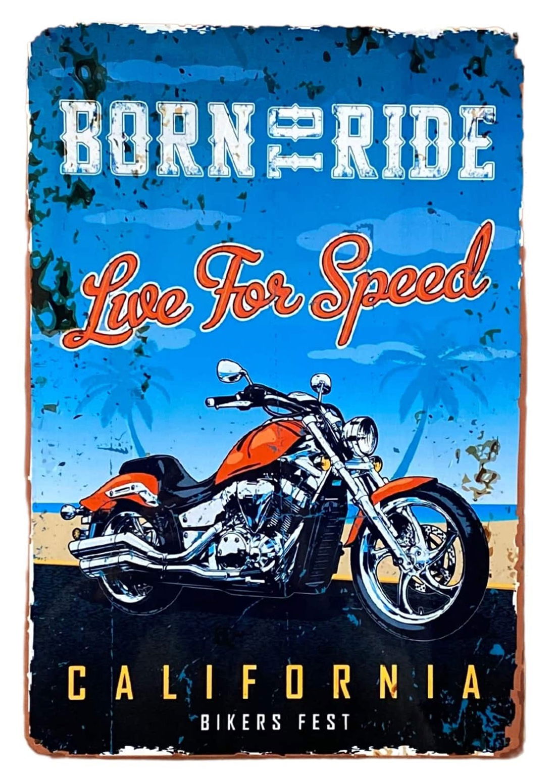Part of our fantastic range of reproduction vintage metal signs. Born To Ride sign. Made in the UK from aluminium, suitable for use inside or outside. Every poster features 4 drill holes for ease of fixing to the wall. Measurements: D0.1 x H41 x W28cm