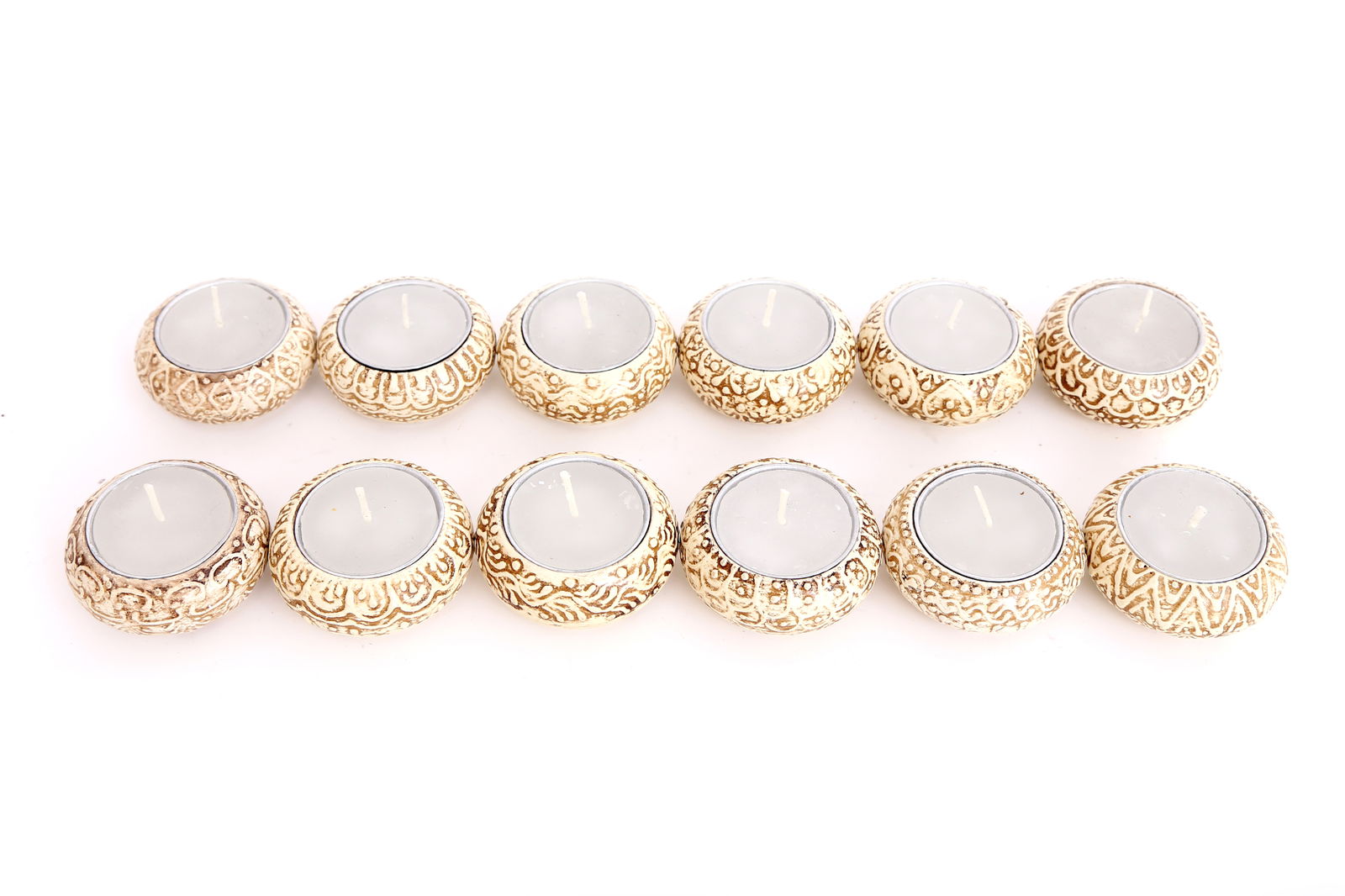 Set of twelve tealights housed in ceramic holders of natural beige tints designs. The ceramic holders are elegantly glazed and the tealights can be removed and replaced when spent. The gentle glow from a tealight brings warmth to every occasion. Measurements: D6 x H2.5 x W6cm SKU: CH6127