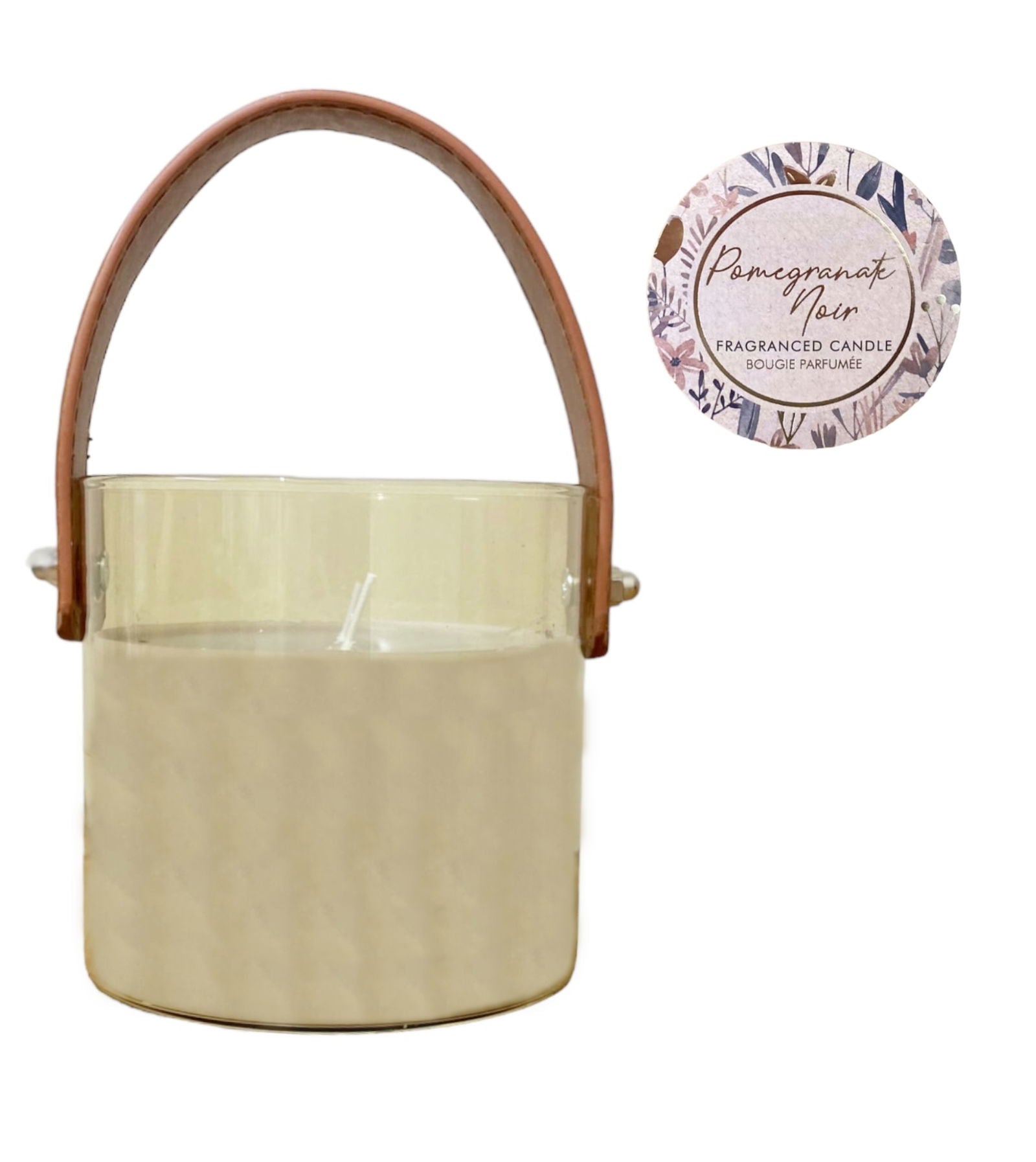 A luxurious, richly fragranced scented candle based on Pomegranate Noir. With leather effect handle. The glass holders can be reused as a candle holder once the candle has been burnt. Measurements: D10 x H10 x W10cm