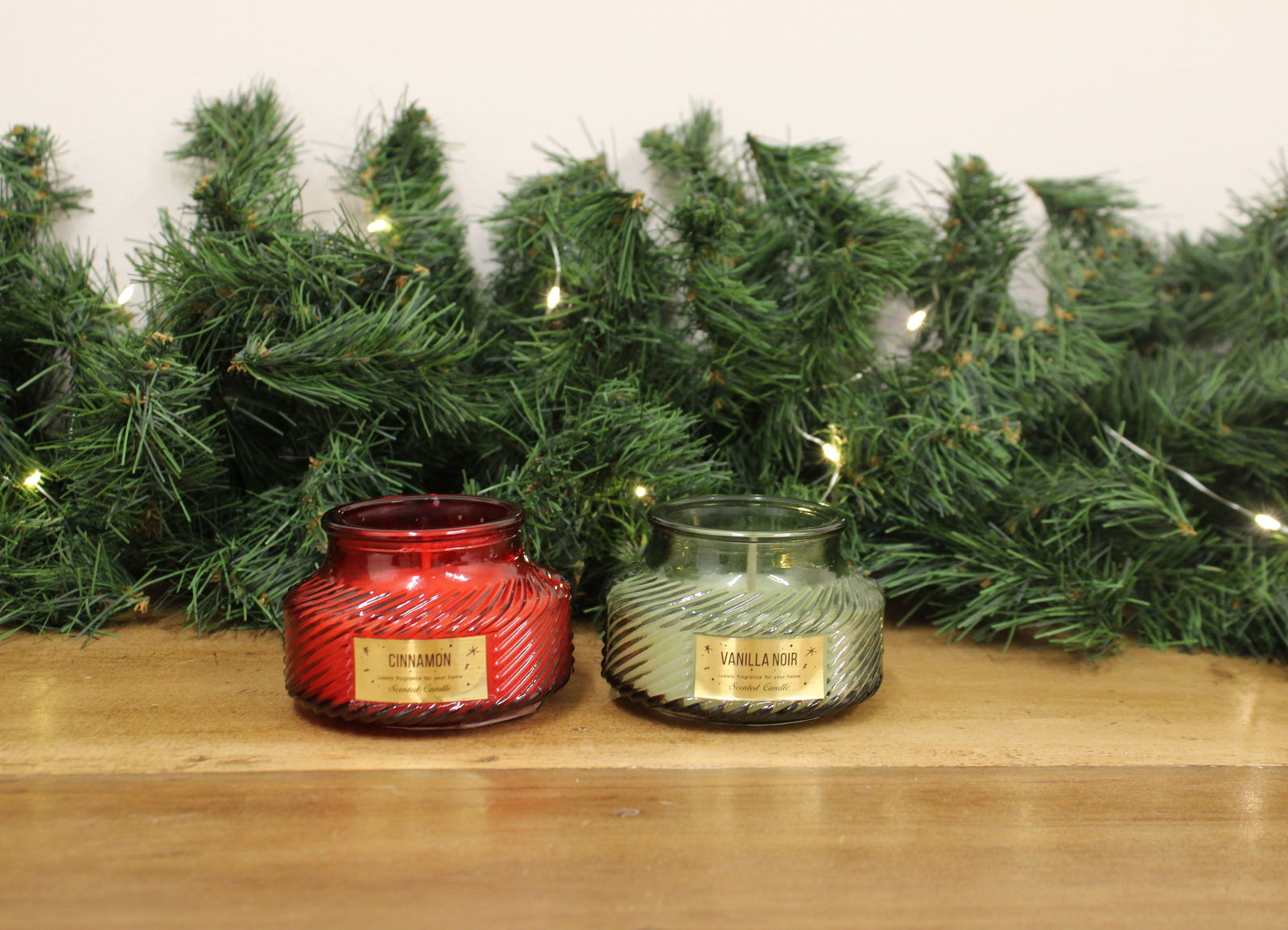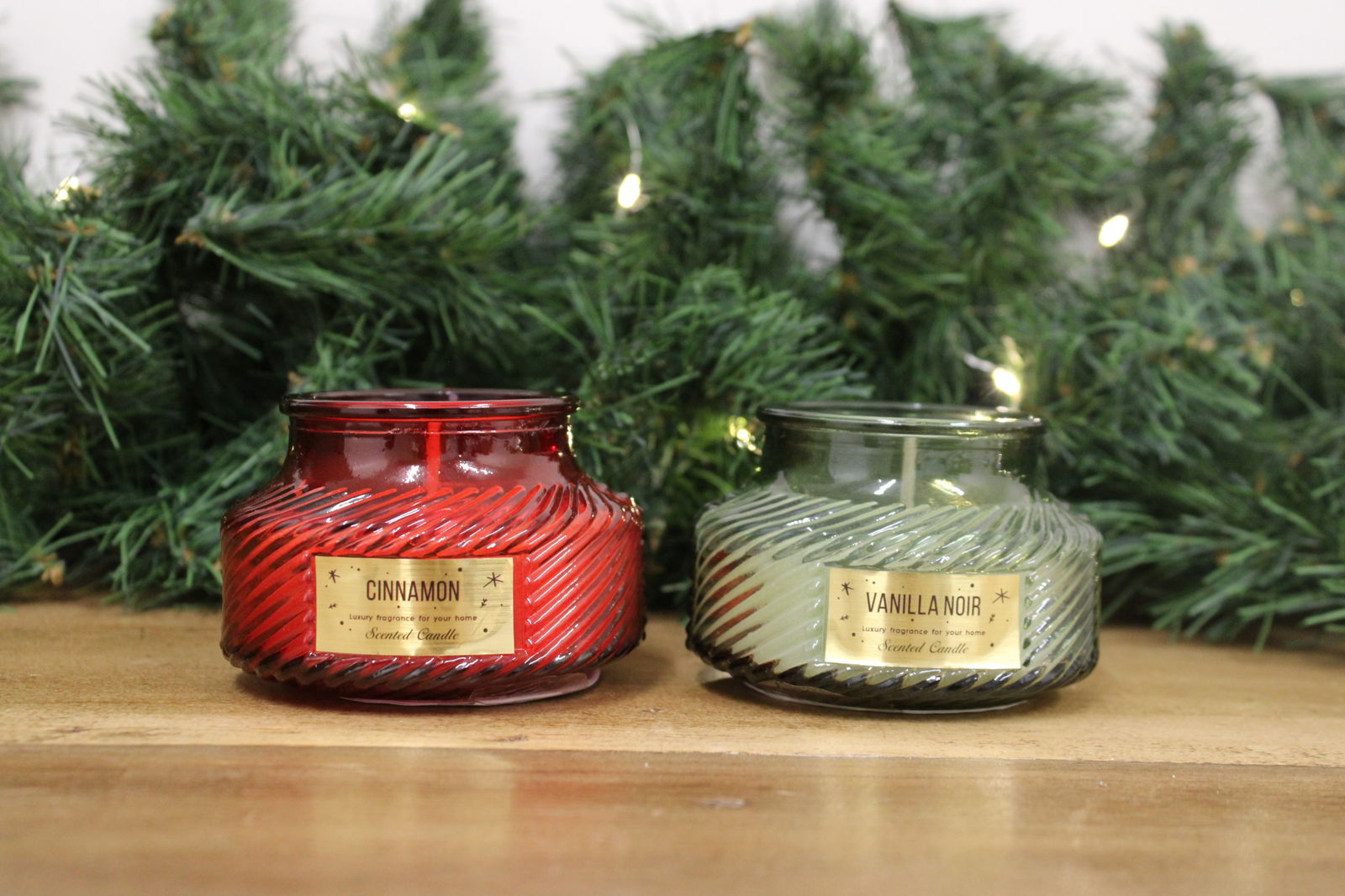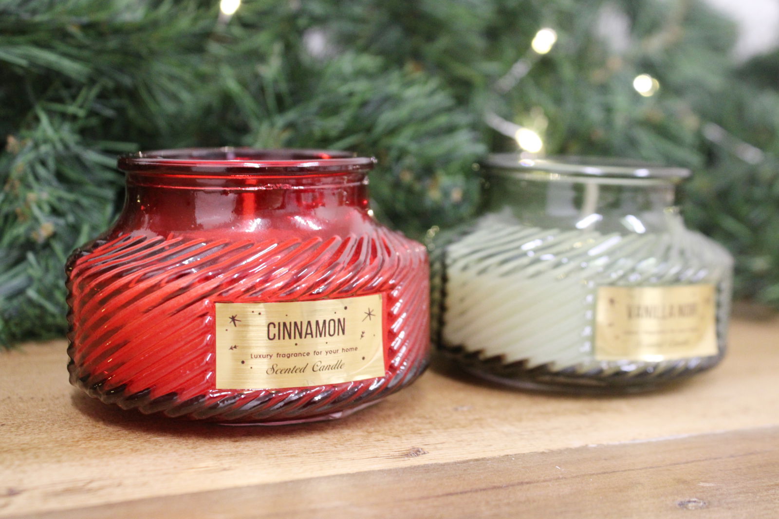 Set of two, green and red ribbed glass candle pots. Red glass pot is fragranced with Cinnamon. Green glass pot is fragranced with Vanilla Noir. Measurements: D8 x H5 x W8cm