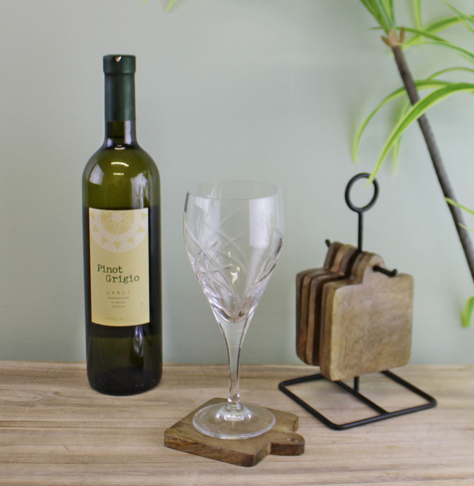 A set of 6 solid wood coasters that hang on a handy metal base for storage when not in use. Each coaster measures approximately 9x9cm. The coasters are made of high quality mango wood and the stand is made of iron. Measurements: 11.5 x 22 x 11.5cm