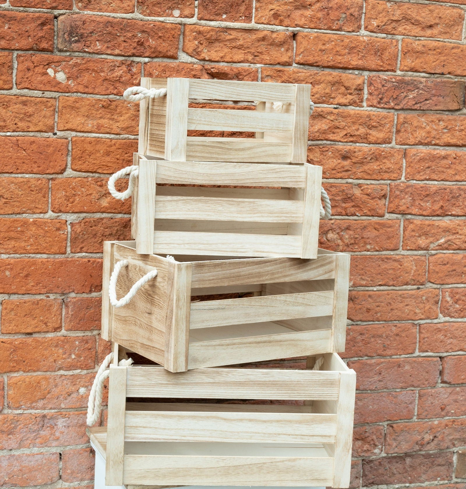 A very attractive set of four slated wooden crates with rope handles are perfect for storage of fruit and vegetables or outside in the potting shed for garden accessories. Set of 4 slated wooden crates with rope handles. The large crates dimensions are 40x30x20cm, the medium crates dimensions are 25x35x18cm, the small crates dimensions are19x30x16cm and the extra small crates dimensions are 16x26x14cm. When nested the overall measurements are: D20 x H40 x W30cm SKU: SG0205