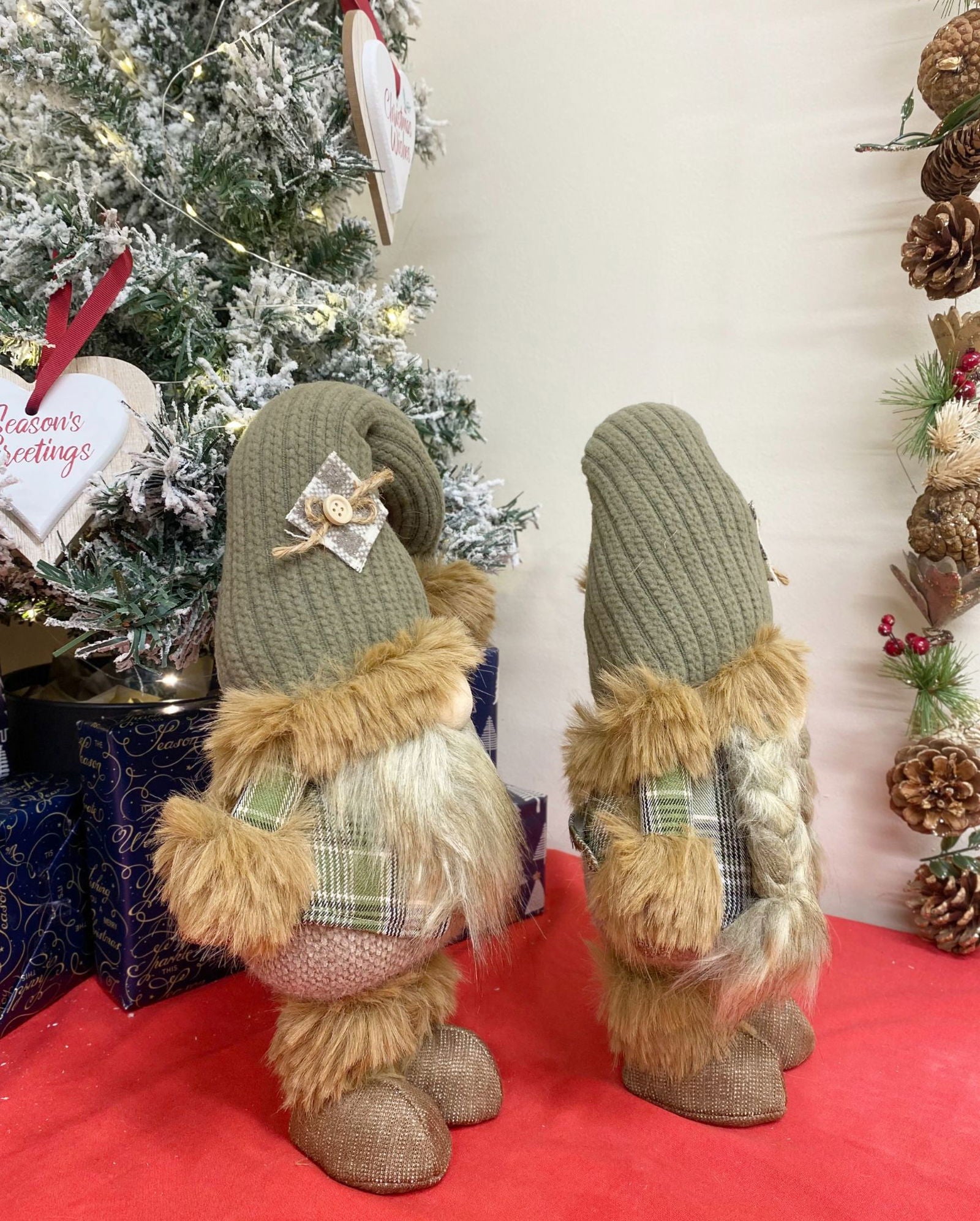 Two green and brown gonk depicting Mr and Mrs. They both have green knitted conical hats with brown fur bobbles, brown tufty hair peeking out under the hat and also on the hands and legs. The body and boots are both brown and they are wearing complimentary green checked waistcoats. Mr gonk has a natural coloured beard and Mrs gonk has two natural coloured long plaits. A comical pair who will add great cheer and amusement to every home over the Christmas period. Their overall height is 38cm with a width of 21cm. The hats and legs are strengthened by a wire frame. Overall measurements are: D12 x H21 x W38cm