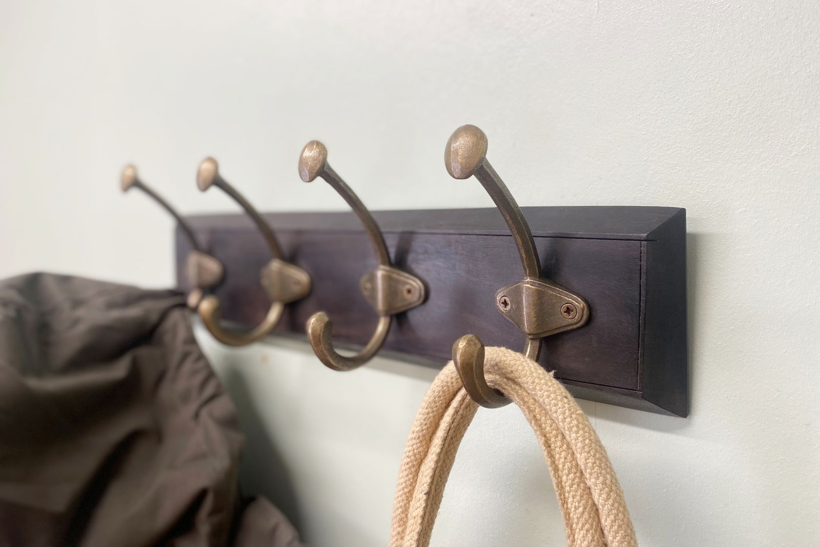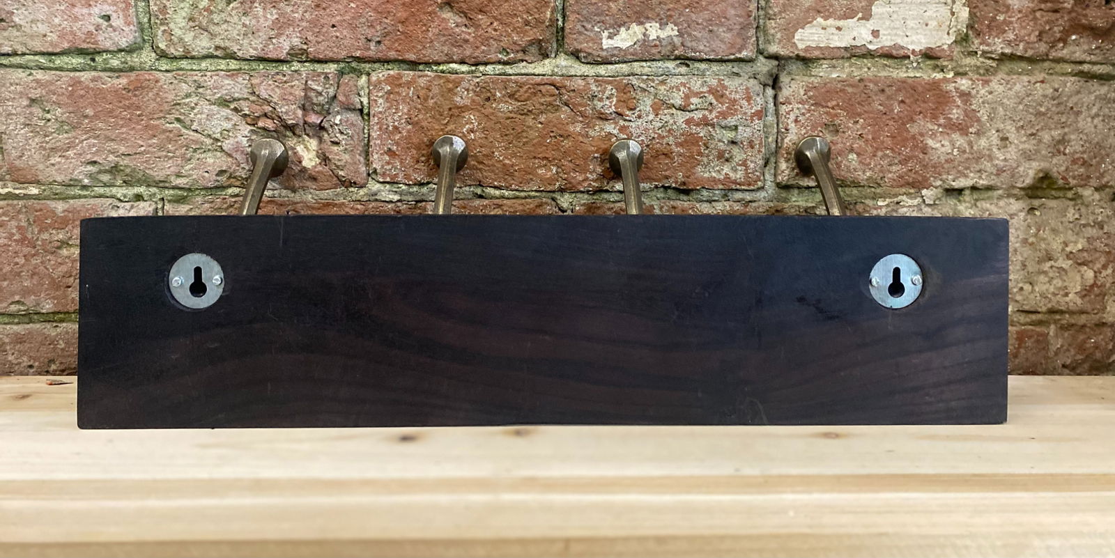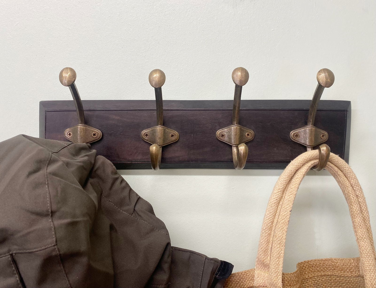 A natural wood plaque with bevelled edge and detailing border. The four large coat hooks are made of burnished brass. The craftsmanship produces an overall effect that is both traditional and elegant. Plaque measurements: H10.5 x W44.5 x D3cm. Hook measurements: H16.5 x W3.7 x D9.5cm. Distance between hooks 6.6cm. SKU: HH5787
