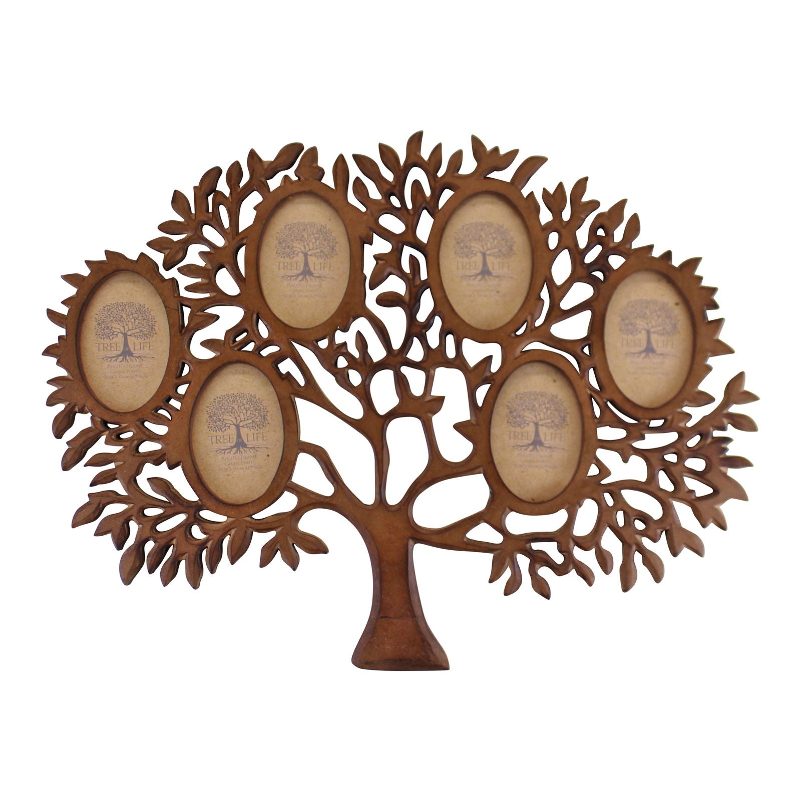 A stunning way to display family photos in this solid wooden photo frame in a tree of life design. Featuring 6 oval shaped spaces for photos with glass fronts. Made of mango wood with glass and featuring 2 fixtures for wall hanging. Measurements: 2 x 45 x 60cm SKU: TL0061