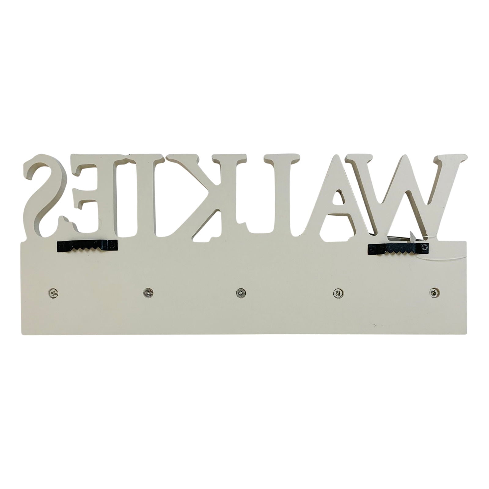 This 'WALKIES' hook board would be perfect in a porch or hallway to hold lightweight coats, leads, collars or harnesses for a dog. The simple grey and white colours would blend into any decor. MDF title Walkies with 5 grey knobs 4.5cm apart. Overall measurements are: D4 x H12 x W29.5cm SKU: PG0071